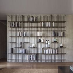 Metrica est une bibliothèque sophistiquée composée de tiges d'acier et d'étagères en verre transparent. La structure exploite le traitement industriel de la tige dans différents diamètres et selon une partition irrégulière.