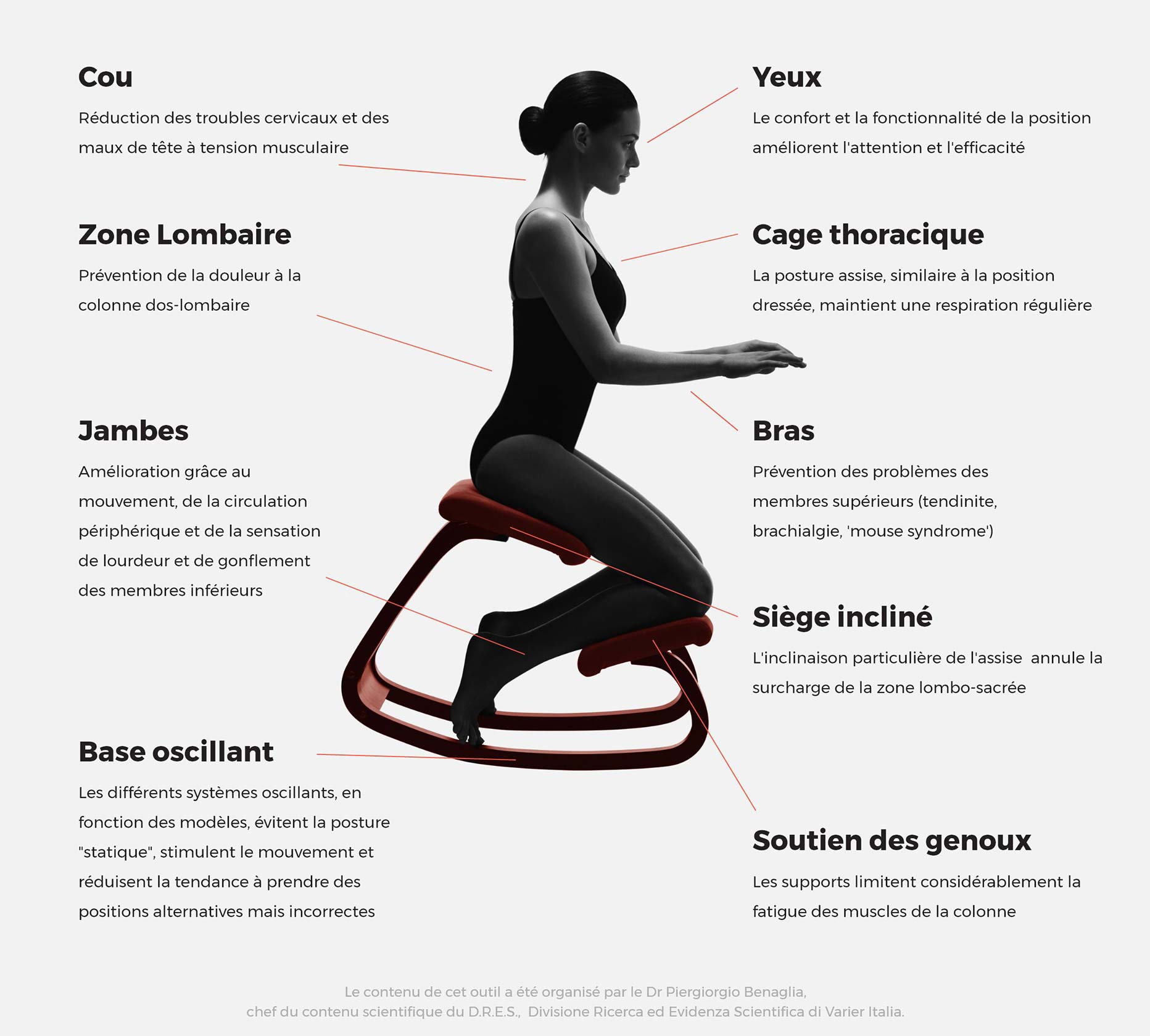 Les fauteuils ergonomiques à genouillère Varier sont conçus sur un principe assez simple. Sur une chaise normale, les jambes sont généralement perpendiculaires au tronc, une position qui conduit souvent à placer le poids du corps sur la colonne vertébrale. L'assise inclinée vers l'avant et le support de genoux des chaises Varier permettent d'élargir l'angle et de soulager les jambes. Le dos prend ainsi une position naturelle et droite.
