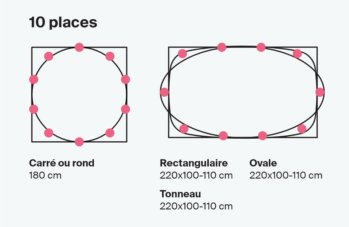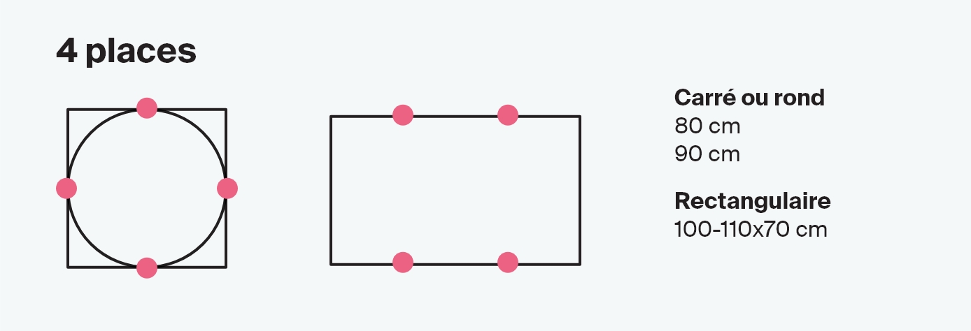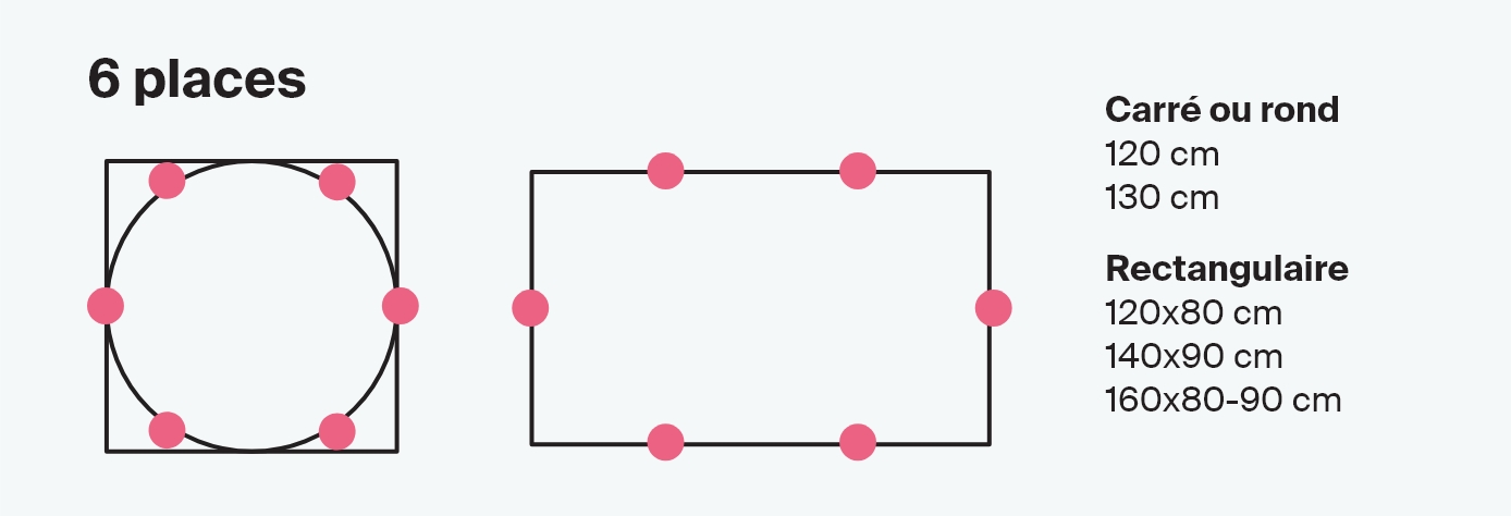 Dans le paragraphe précédent, nous avons indiqué qu'en moyenne une personne assise à une table occupe une surface de 60 x 40 cm, mais lors du choix des dimensions de la table, il est utile d'évaluer qu'elle est bien proportionnée également par rapport aux dimensions de la pièce. Le tableau ci-dessous montre les tailles les plus courantes pour les tables de 4, 6, 8 personnes et plus, mais bien sûr, si vous pouvez ajouter quelques centimètres supplémentaires pour vos invités, cela sera apprécié.