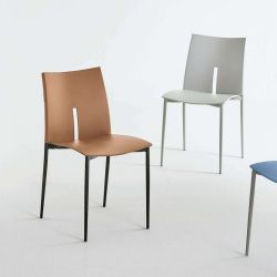 Chaise moderne, avec structure en acier et assise en polypropylène. Son design est simple et caractérisé par des lignes définies et dynamiques. Le dossier carré est décoré au centre d'une découpe dans la zone lombaire qui l'étire vers le haut. Cette chaise est parfaite pour décorer les cuisines modernes.