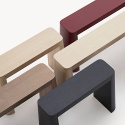 Mule est une famille de bancs en bois à la forme sculpturale élégante, construits avec deux monolithes en bois massif qui soutiennent le siège suspendu.