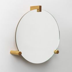 Un miroir mural rond pourvu de crochet porte-vêtements et d'étagère cachée.