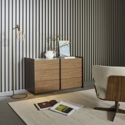 Les compléments de la collection Aureo, composée d'une commode et d'une table de chevet assorties, se distinguent par l'équilibre parfait entre fonctionnalité et harmonie des proportions, inspiré du principe du nombre d'or.