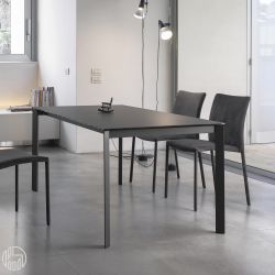 La table est extensible grâce à un système d'extensions en bois avec la même finition que le plateau (dans le cas des plateaux en verre, marbre ou céramique, le bois est laqué de la même couleur).