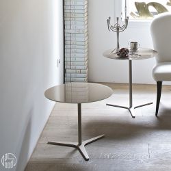 Une petite table design équipée d'un piétement central, essentielle soit dans la forme que dans les matériaux. Elica est composée d'une tige centrale qui se pose sur 3 branches. Le plateau est un disque en cristal de 50 cm de diamètre.
