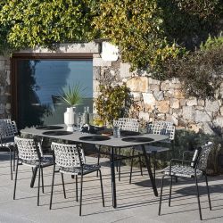 La structure est réalisée en tube métallique peint, tandis que l'assise et le dossier sont tressés en corde tortuga, une tresse en fil de polypropylène, idéale pour les environnements extérieurs : elle résiste aux rayons UV, à l'abrasion, aux moisissures et aux champignons.