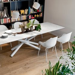La table extensible , modèle Duel de Connubia, est réalisée à partir d'une structure tissée caractéristique en métal verni noir mat, blanc optique mat ou gris tourterelle mat tandis que le plateau est en céramique couplée à du verre disponible dans la variante :