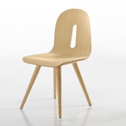Chaise design complètement réalisée en bois de frêne. Les quatre pieds qui sont légèrement inclinés vers le centre de l'assise et dont le profil est souple et arrondie, sont parfaitement compatibles avec les formes tout aussi délicates du siège.