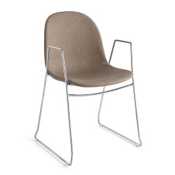Assise et dossier sont rembourrés et recouverts en simili cuir Ekos ou Vintage, cuir régénéré ou tissu polyester, la base à piétement traineau est en métal chromé ou peint noir mat, comme les accoudoirs.