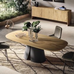 La table Cosmopolitan de Devina Nais allie polyvalence et élégance. Son plateau raffiné en bois massif avec finition chêne texturé s'associe aux pieds de la collection, disponibles dans une large gamme de matériaux : verre, fer ou bois.