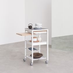 Ce chariot de cuisine est un système modulaire très polyvalent, au design essentiel qui s'adapte facilement à différents contextes d'ameublement. À partir des éléments structurels, le chariot peut être personnalisé avec une large gamme d'étagères et d'accessoires.