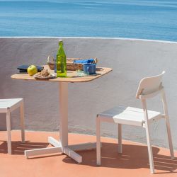 La structure en aluminium est disponible en différentes coulers. La colonne centrale avec section carrée termine avec une base 4 pieds. Le plateau carré en teak mesure 79 x 79 cm.