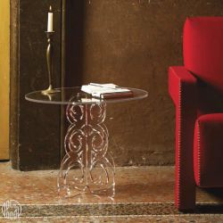 La base de cette table basse moderne et raffinée est donnée par la jointure orthogonale de deux feuilles de méthacrylate transparent de 8 mm d'épaisseur, dans lesquelles est sculpté un dessin stylisé de vagues et de boucles.