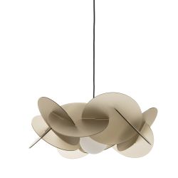 Bea est une lampe à suspension au design unique grâce à l'abat-jour composé de disques de méthacrylate assemblés de manière irrégulière. Le support métallique de l'abat-jour est blanc pour la lampe en méthacrylate satiné transparent, tandis que pour les autres coloris il est en métal gris foncé.