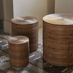 Il est entièrement fabriqué en rotin naturel teinté foncé. Le matériau crée un beau contraste avec la forme simple et épurée des paniers et donne une expression douce et organique.