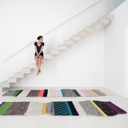Tapis design en laine avec une forme inhabituelle et une texture colorée. La texture change de fil, de couleur et de direction. La forme ressemble à la manche de chandails chauds faits à la main. Le tapis Mangas donne une touche de style à n'importe quel environnement.