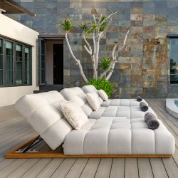 Blow est une chaise longue rembourrée, conçue pour offrir confort et style dans tous les espaces extérieurs, des jardins privés aux espaces extérieurs des hôtels et des clubs.