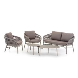 La structure du canapé et des fauteuils est en aluminium peint. Le dossier et les accoudoirs forment un seul corps, caractérisé par un tissage en corde acrylique rembourré. Les coussins moelleux sont recouverts de tissu extérieur amovible.