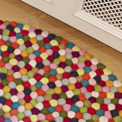 Ronde, elle est composée de petites sphères de couleurs différentes en feutre de laine, placées côte à côte. Les balles sont fabriquées à la main au Népal selon des méthodes traditionnelles.