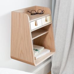 Suzon est un meuble mural en bois de petites dimensions qui lui permettent de se réinventer selon nécessité en table de nuit ou consolle pour l'entrée.