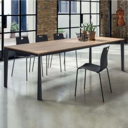 La structure en acier peint est disponible en différentes couleurs. Les dimensions de la table sont de 190 x 100 x 75 cm, le plateau rectangulaire peut être rallongé jusqu'à 270 x 100 cm grâce à une rallonge latérale dans la même finition que le plateau.