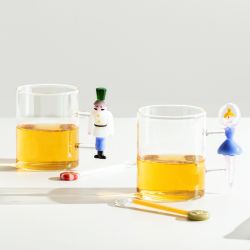Le corps transparent de la tasse, au style essentiel et linéaire, devient la toile d'une délicieuse scène « miniature » sur le fond représentant des personnages typiques de Noël.