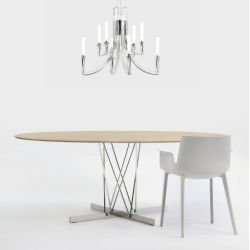 La structure en métal chromé a un design à forte personnalité, qui fait de cette table un élément central de la pièce. Le plateau est en MDF plaqué ; le bois est certifié FSC.