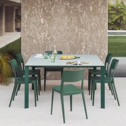 La table Akashi est également disponible avec un plateau rectangulaire pour une utilisation intérieure et extérieure .