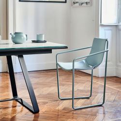 Le cadre en forme de luge et les accoudoirs pratiques sont en métal peint. Accueillante et confortable, l'assise est en cuir naturel, en cuir toscan ou en nubuck.