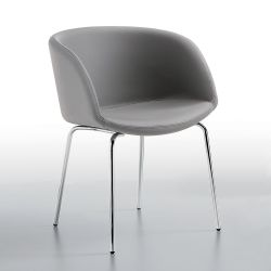 Le piètement à quatre pieds est en métal peint en plusieurs couleurs. L'assise rembourrée et confortable peut être revêtue de divers tissus, de similicuir ou de cuir véritable.
