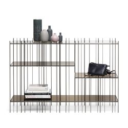 Metrica est une élégante console en métal avec des étagères en verre, fabriquée avec des tiges en acier.