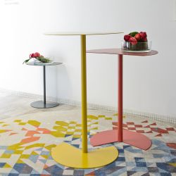 Le plateau (dimensions 60 x 60 cm) et la base ont une forme de forme originale qui permet à la table d'être placée à côté du mur ou couplée à une table similaire.