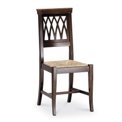 Chaise en bois de style rustique réalisée en bois massif de hêtre. Le dossier, légèrement séparé de l'assise, est ouvragé de motifs en forme de arches gothiques qui rendent cette chaise particulièrement élégante et appropriée également au séjour.