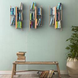 Bibliothèque design suspendue au mur, avec des étagères alternées.