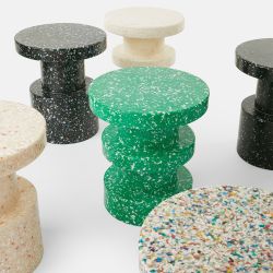 Le tabouret, de toutes les couleurs, a un aspect pixélisé que lui donnent les petits morceaux de plastique 100% recyclé à partir desquels il est fabriqué. Grâce à un processus particulier de rotomoulage avec du polyéthylène flexible thermoplastique basse densité