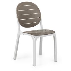 Cette chaise empilable est disponible en version bicolore avec une structure blanche et une assise gris tourterelle .