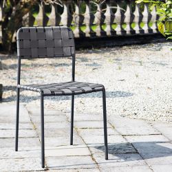 Chaise moderne avec structure en métal peint en graphite, assise et dossier en sangles élastiques grises entrelacées.