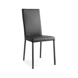 La structure à section carrée est en acier, tandis que l'assise et le dossier sont rembourrés et recouverts de similicuir.