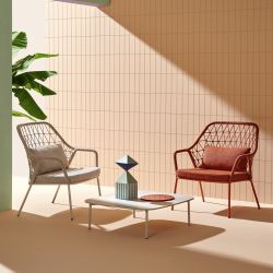 La structure Panarea est en acier peint de différentes couleurs, recouvert de corde synthétique tissée avec un motif géométrique, de la même couleur que le cadre. L'assise à lattes métalliques est rendue confortable par les coussins rembourrés : un pour l'assise et un pour le dossier.
