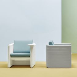 Le fauteuil Sunset est entièrement réalisé en polyéthylène, le volume carré est défini par des bords arrondis, le dossier légèrement incliné et les accoudoirs créent une assise accueillante et relaxante. Idéal pour profiter d'une ambiance ensoleillée en plein air.
