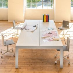 Table de bureau ou table de réunion dotée de structure en aluminium anodisé. Le style moderne et très fonctionnel, permet d'équiper les bureaux open space et les salles de réunion.