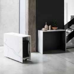 La table Archimede est dotée d'un compartiment de rangement pour les chaises qui, lorsqu'il n'est pas utilisé, peut être replié et rangé dans une console. Les côtés longs du compartiment de rangement sont ainsi recouverts par le plateau, tandis que les côtés courts sont cachés par les côtés de la console.