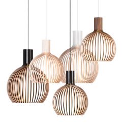 Fabriqué à partir de lattes de placage de bouleau, il est fabriqué à la main en Finlande par des artisans qualifiés. Les finitions disponibles sont le bouleau naturel, le stratifié noir ou blanc ou le placage de noyer. Toutes les couleurs sont combinées avec le câble et le plafonnier blanc sauf pour le modèle noir où ils sont noirs.