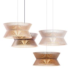 Le lustre classique est réinterprété dans une nouvelle version où les feuilles de bois s'entrelacent, créant d'amusants jeux de lumière. La forme ouverte permet un large faisceau lumineux.