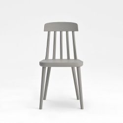 Chaise moderne en bois caractérisée par le dossier muni de cinq fuseaux en bois massif transformés séparément. Elle est idéale pour l'aménagement d'espaces modernes domestiques et contract.