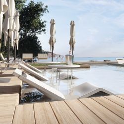 Fabriqué en polyéthylène ou dans la finition spéciale Moleskine, le lit de bronzage Aqua est empilable jusqu'à 6 unités ; le siège peut être incliné dans plusieurs positions.