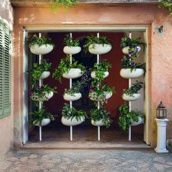 Green Pills est une jardinière modulaire avec laquelle créer de petits ou grands jardins verticaux à l'intérieur et à l'extérieur. Il se compose d'un mât central autoportant en aluminium peint, équipé d'un système de fixation au sol et au plafond. Les vases à fleurs peuvent être fixés à la hauteur souhaitée ; ils sont en polyéthylène.