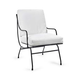 Le fauteuil a une structure en barre d'acier peinte en noir et deux coussins moelleux recouverts de tissu blanc.