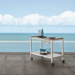 Le chariot Cart a une structure en métal avec deux inserts en teck qui servent de poignées pratiques, deux étagères pour supporter les assiettes, les verres et les casseroles, et des roues pivotantes à 360 °.