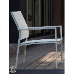 La structure en aluminium est disponible en différentes couleurs. L'assise et le dossier de la même couleur que la structure sont recouverts de textilène, un tissu synthétique respirant très résistant aux agents atmosphériques.